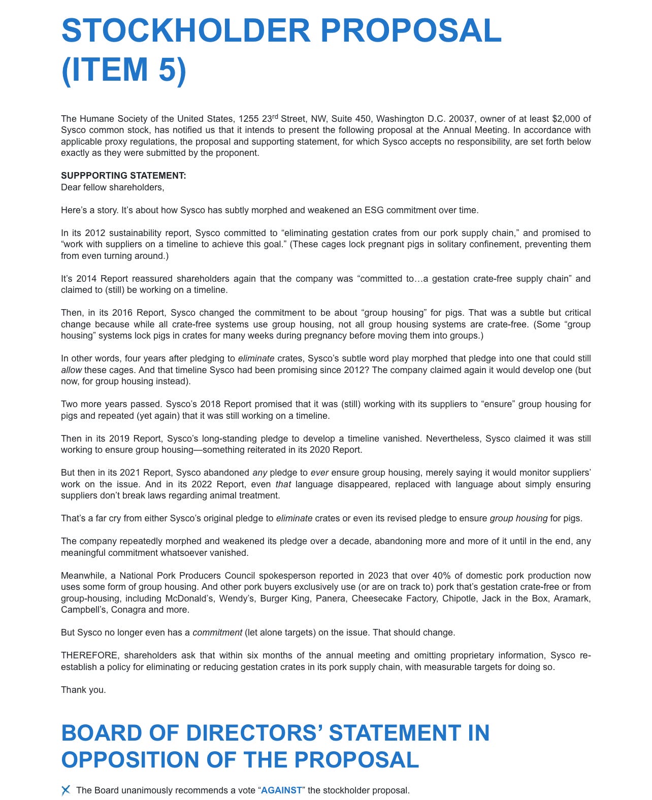 Sysco (SYY): a notable 31% support for re-establishing a policy for eliminating or reducing gestation crates in the Company’s pork supply chain